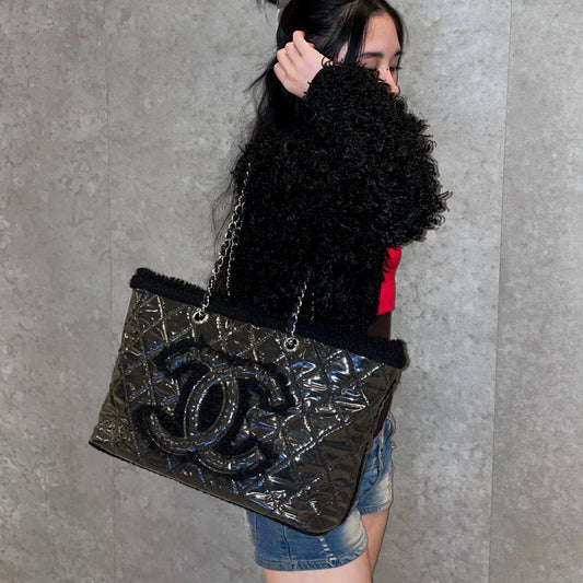 RARE☆☆☆ CHANEL Matelassé Jumbo Coco Mark Fleece PVC Chain Shoulder Tote Bag