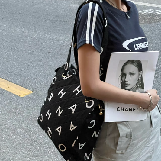 RARE☆☆☆☆CHANEL 1997 Matelassé Canvas Logos Graffiti Tote Shoulder bag Black & White
