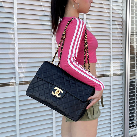CHANEL Matelassé Jumbo CC LOGO Chain Shoulder Single Flap Bag Black & Gold #