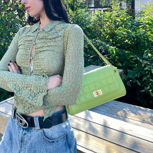 RARE☆☆☆ CHANEL Choco Bar 2.55 Double Chain Shoulder Flap Bag Green Lambskin Leather