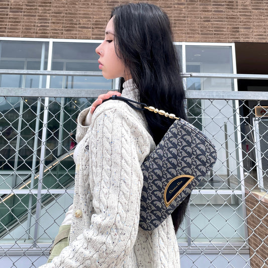 CHRISTIAN DIOR Trotter Canvas Malice Pearl Shoulder Bag Navy & Gold