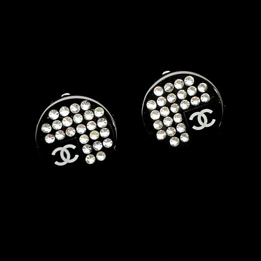 CHANEL Rhinestone Coco Mark Round Earrings 05P Acrylic Black Silver