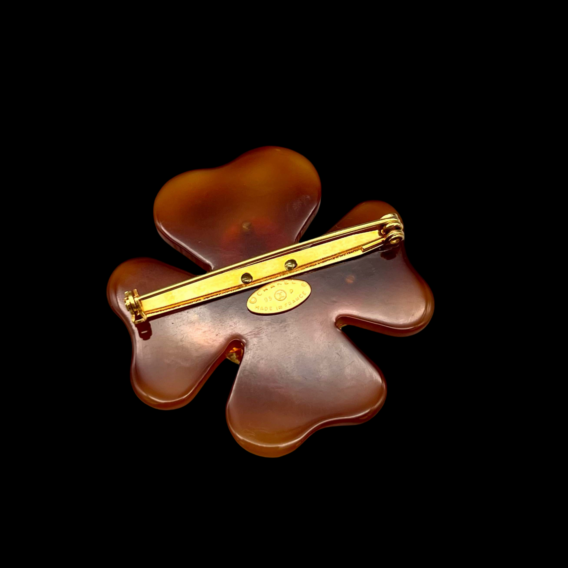 RARE☆☆☆☆CHANEL 1995 Tortoiseshell-Style Four-Leaf Clover CC LOGO Brooch 95P Brown & Gold
