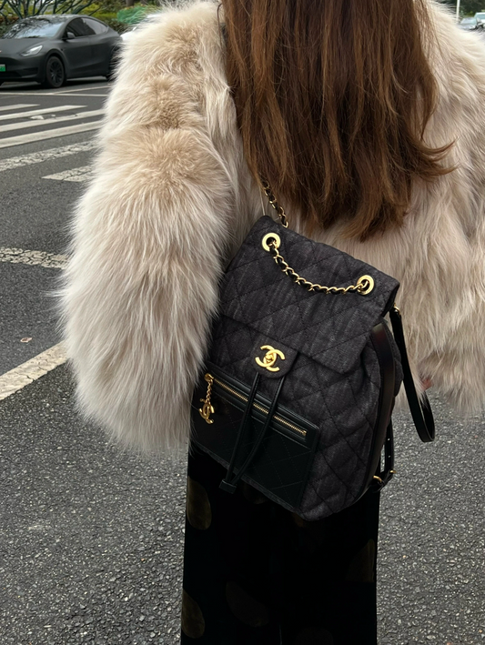 RARE☆☆☆☆CHANEL Matelassé Denim CC LOGO Pendant Métiers d'Art Paris-Salzburg Chain Strap Backpack Black & Gold #