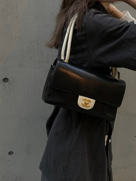 CHANEL Punching Leather Bicolor Double Shoulder Single Flap Bag Black & White