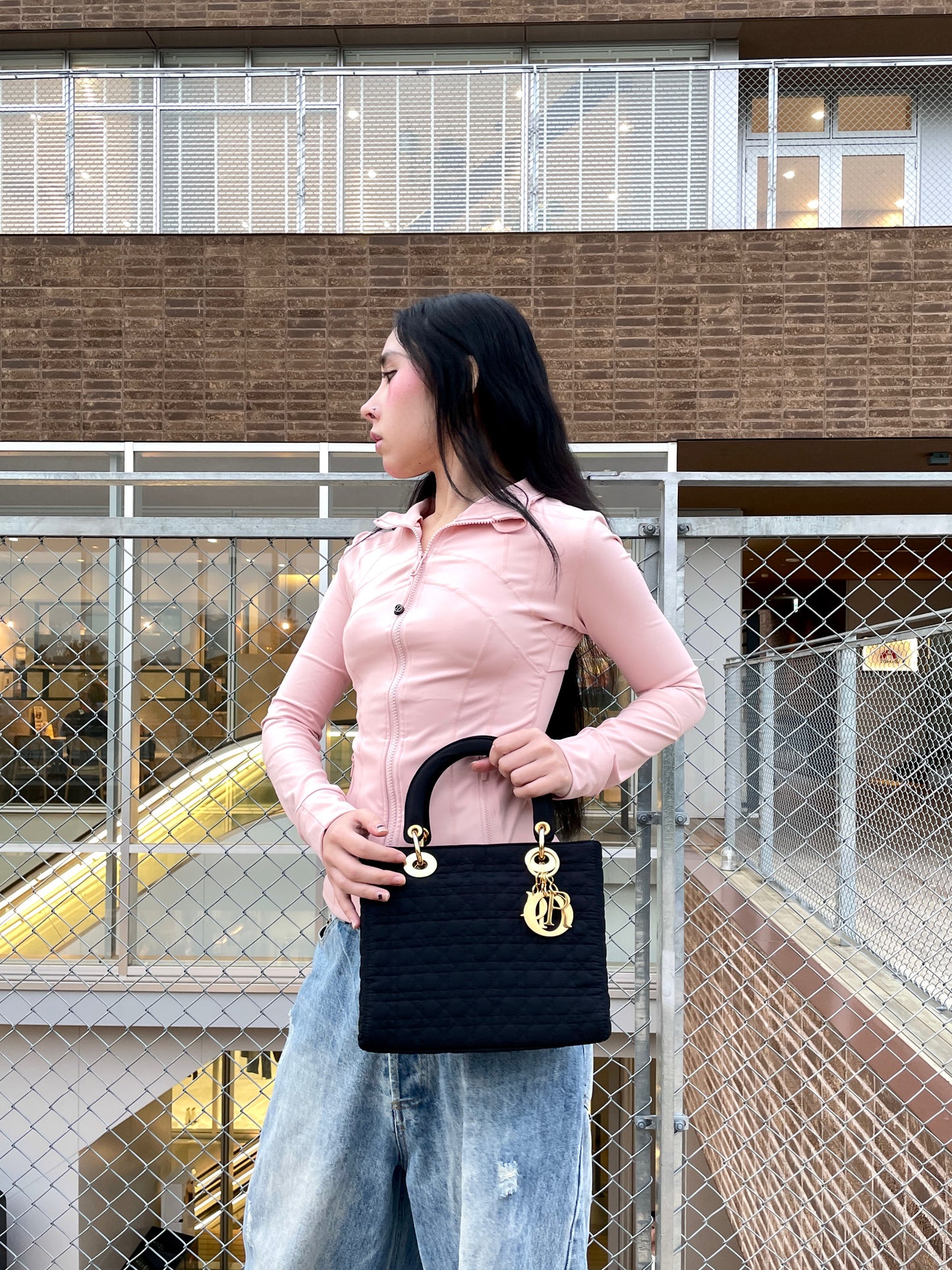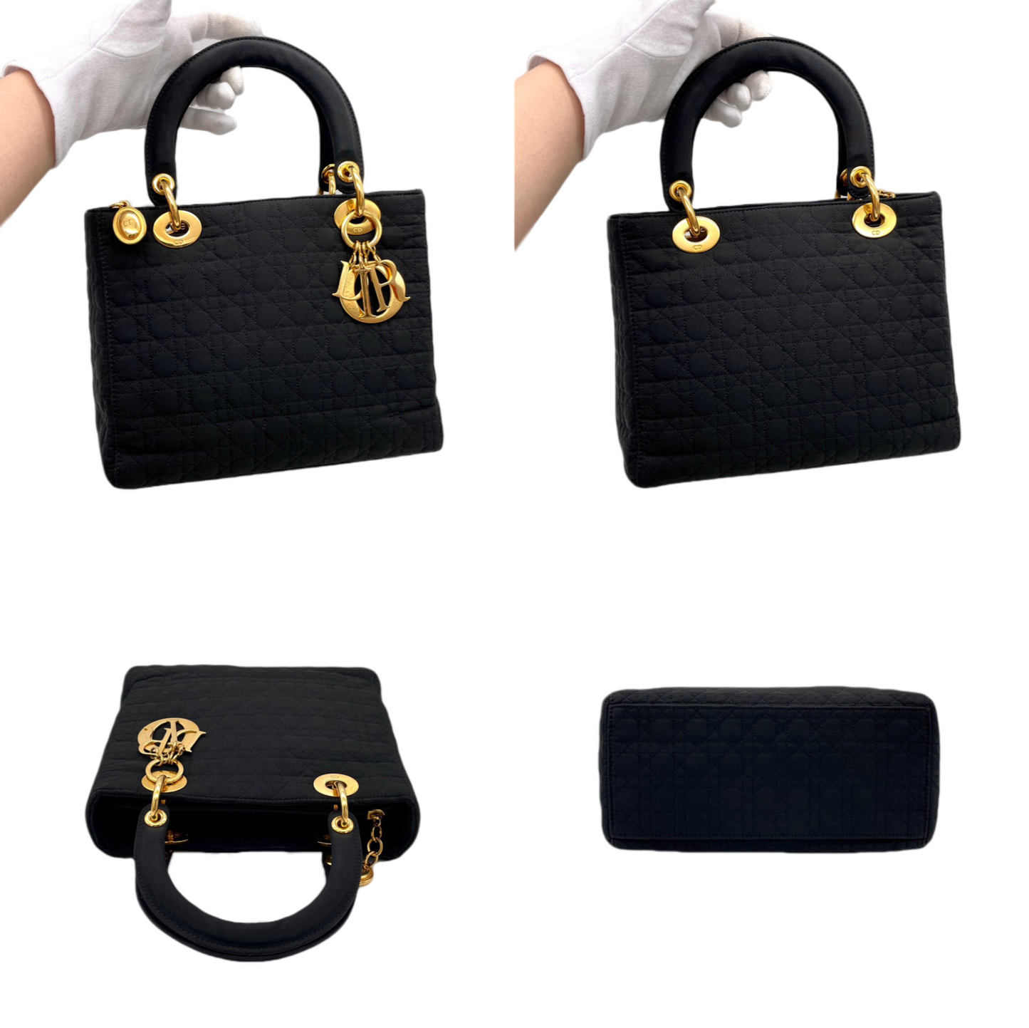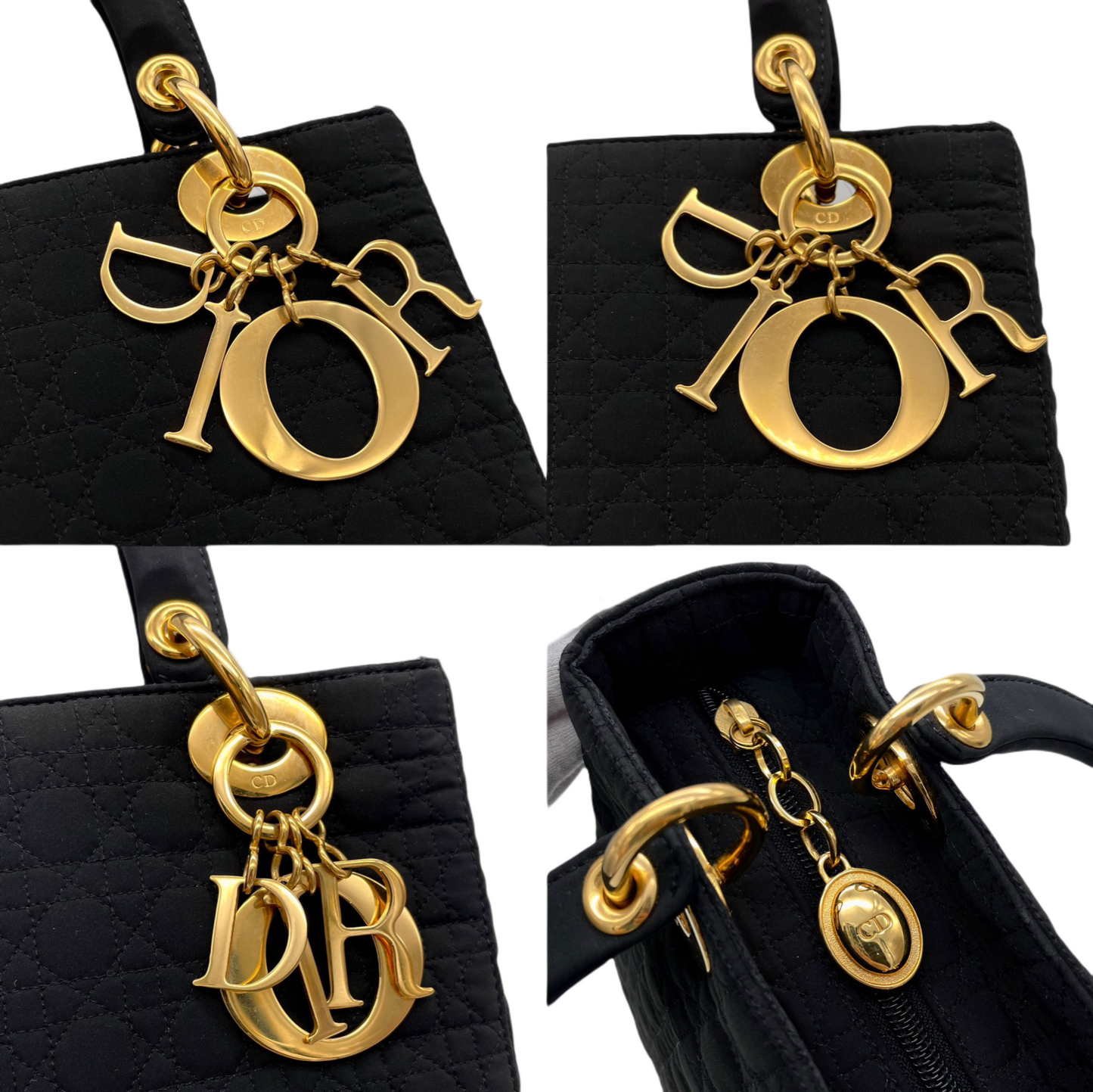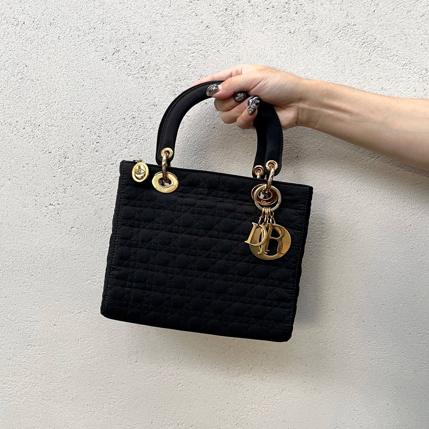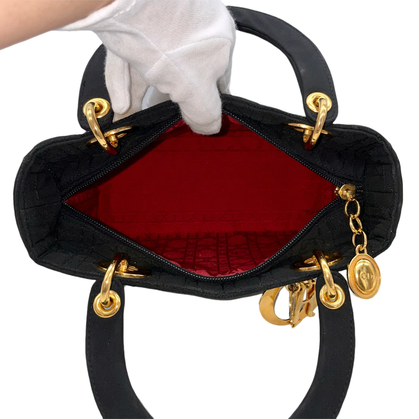 CHRISTIAN DIOR Lady Dior Line Cannage Nylon Hand Bag Black/Gold
