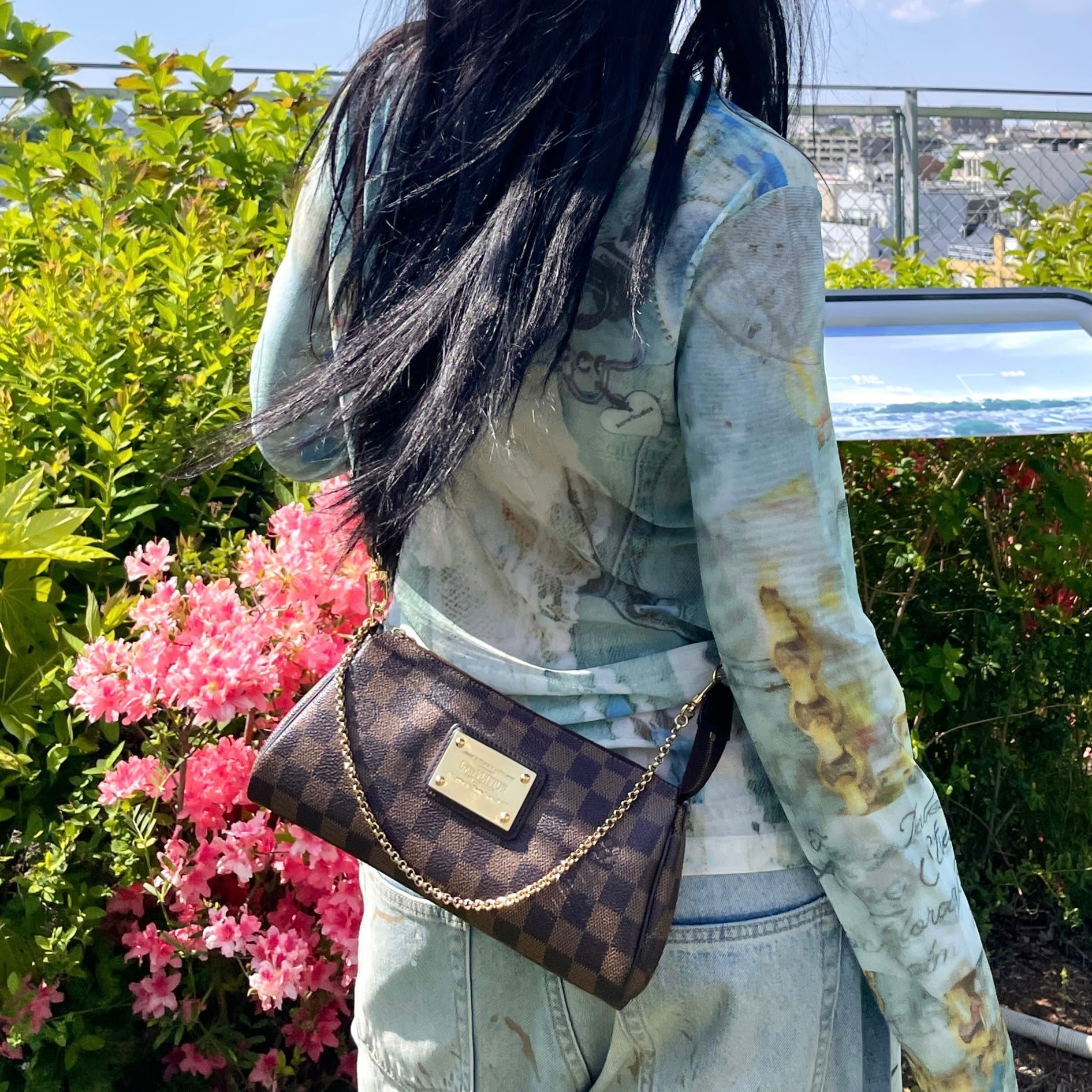 LOUIS VUITTON Damier Ebene Eva N55213 Chain Handle 2-Way Hand Bag Pouch Shoulder Bag Brown & Gold