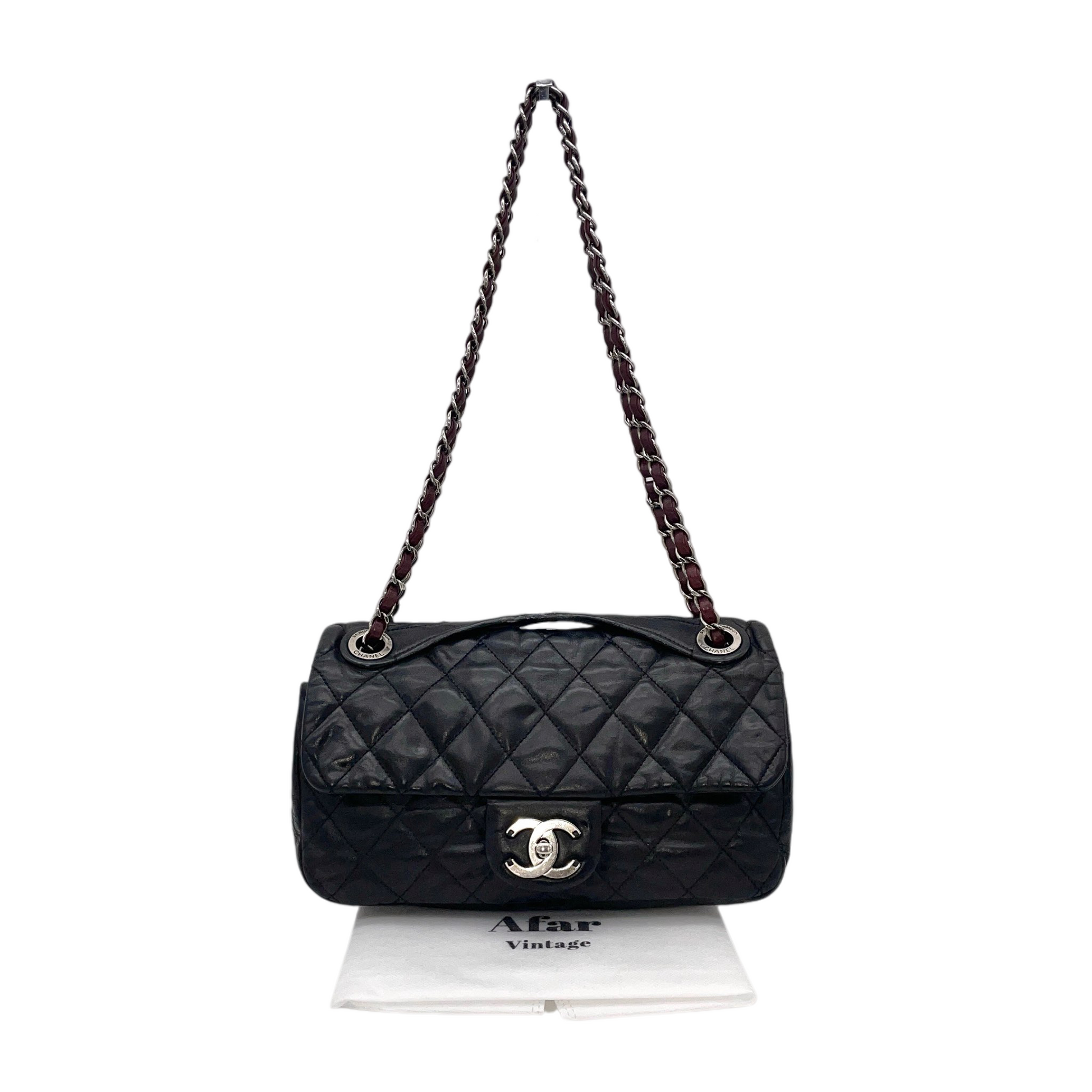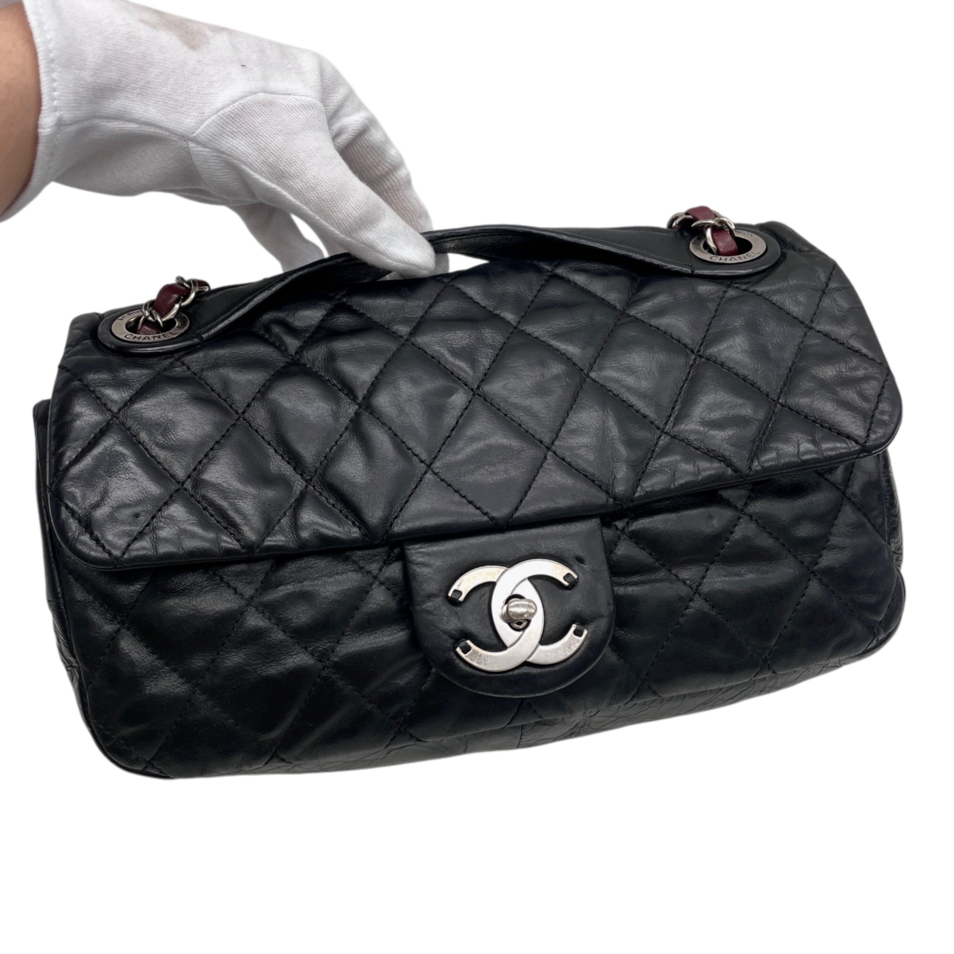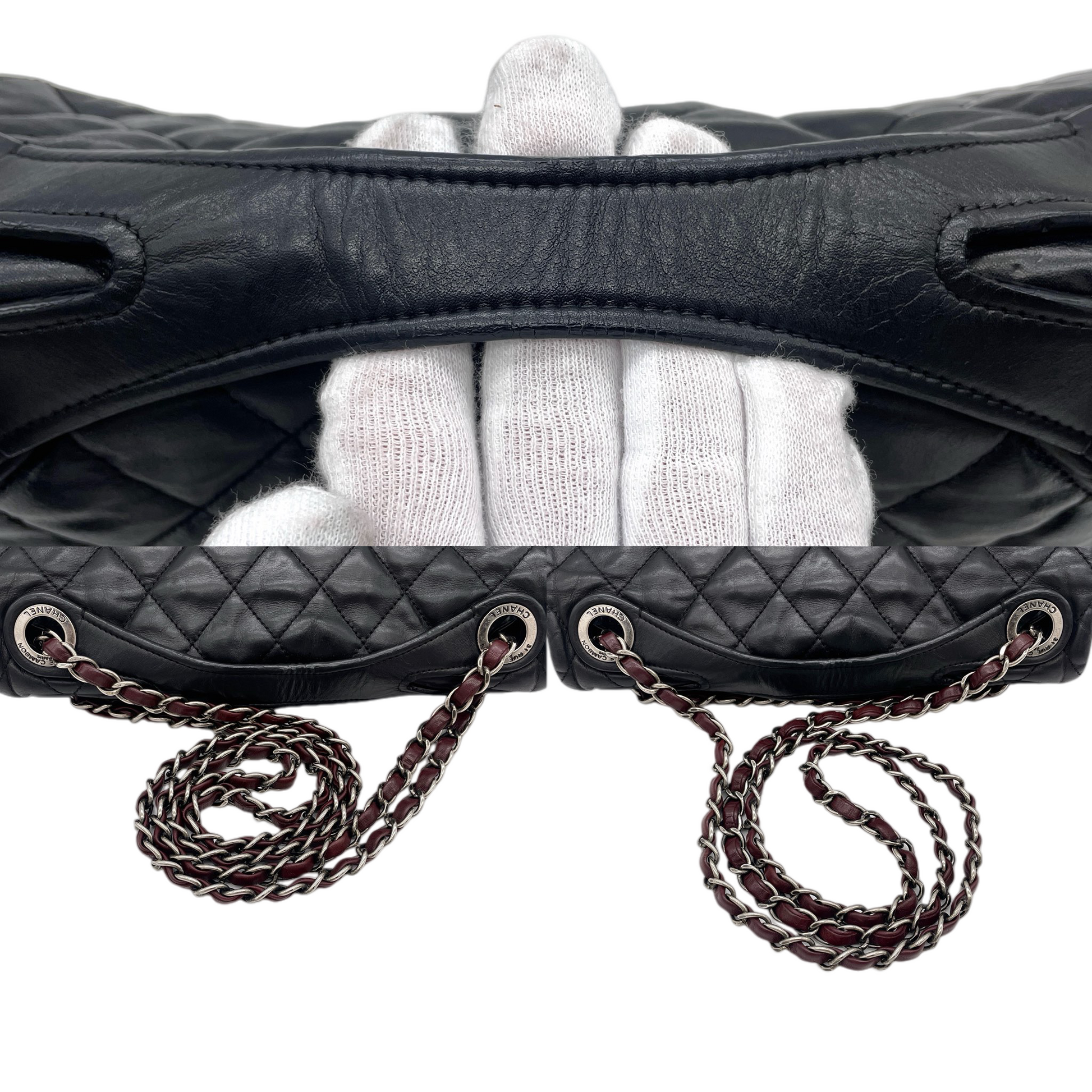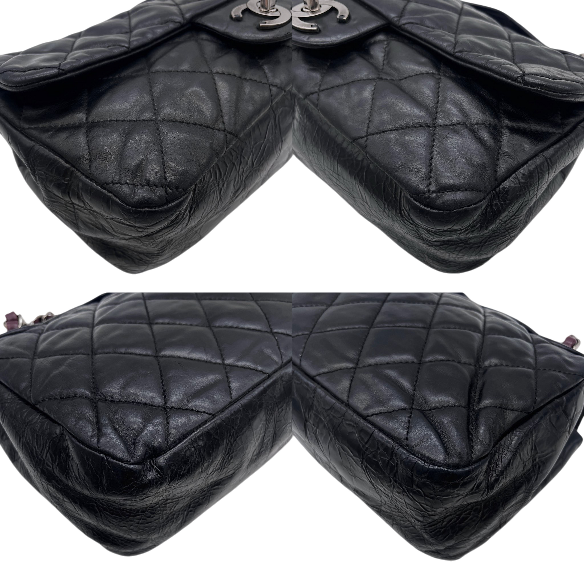 RARE☆☆☆CHANEL 2010 Matelassé Iridescent Calfskin Double Chains Single Flap Shoulder Bag Black & Silver