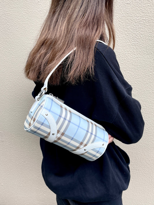 BURBERRY 格纹单肩托特包 帆布/皮革 米色/文胸造型