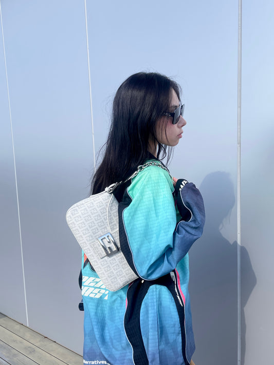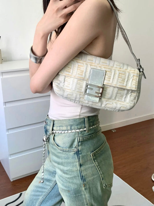 RARE☆☆☆ FENDI Zucchino Chain Shoulder Mamma Baguette White × Gray SHW