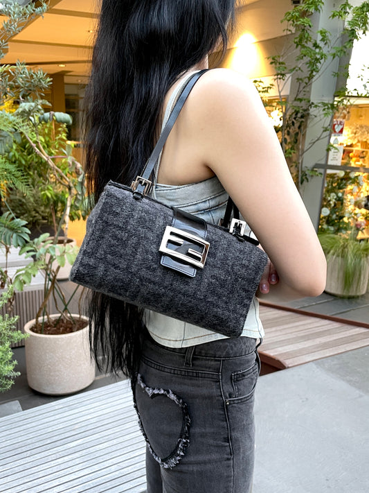 FENDI ZUCCA Wool Shoulder Bag Gray x Silver