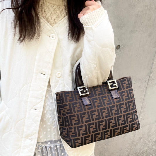 FENDI Zucca Canvas FF LOGOS Tote Hand Bag Brown & Silver
