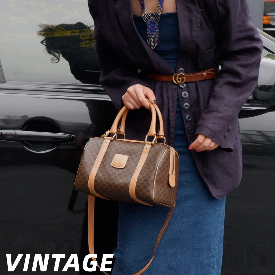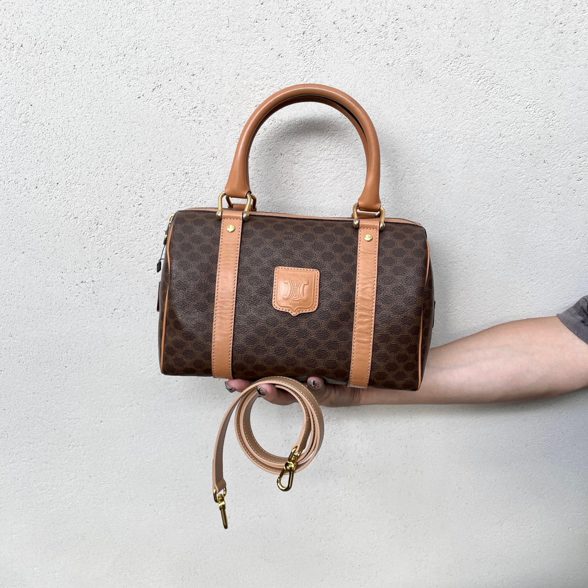 CELINE Macadam Canvas coated Boston Handbag PM Brown & Gold
