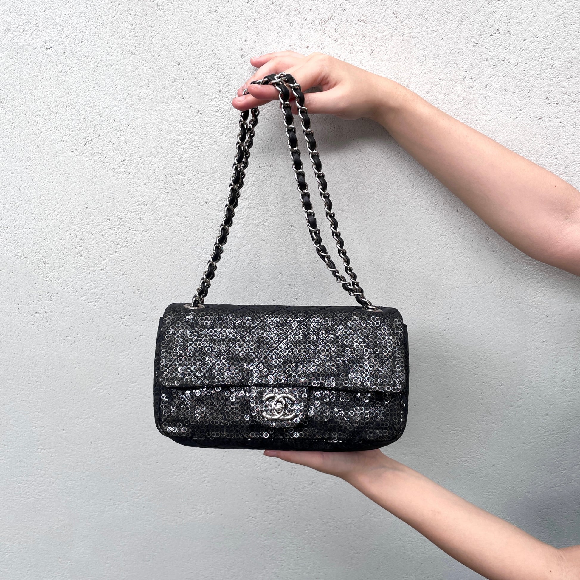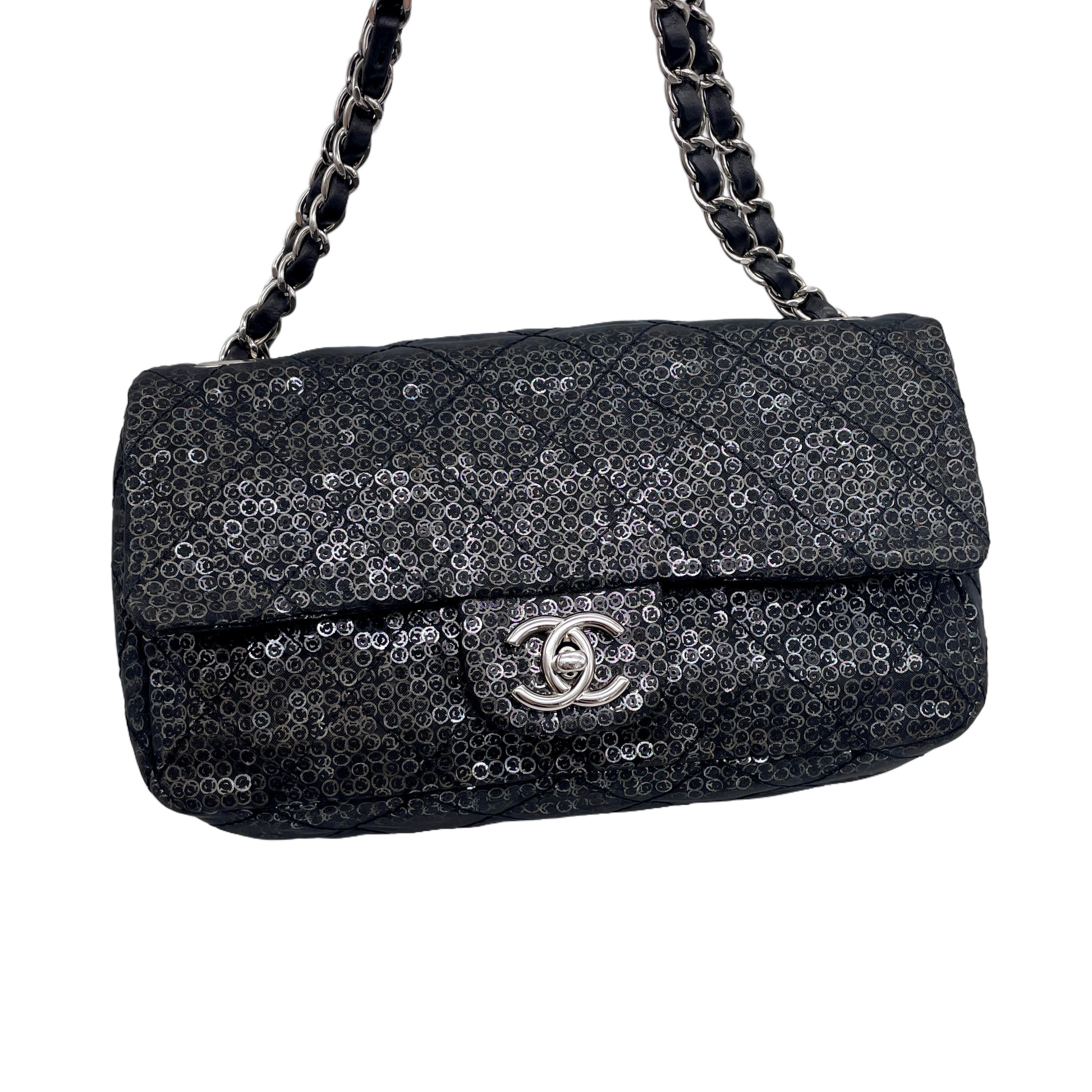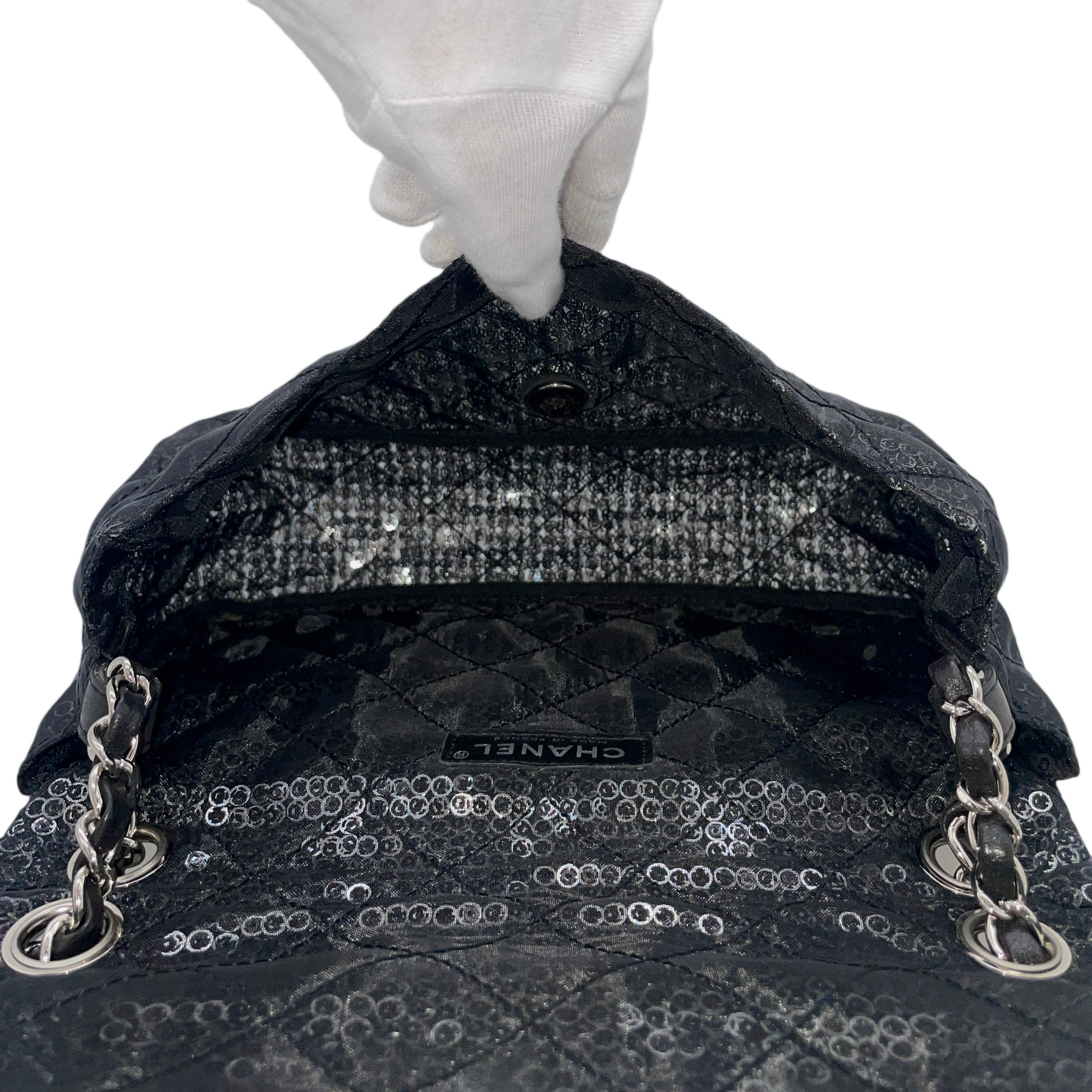 RARE☆☆☆☆CHANEL 2008 Matelassé Mesh Sequins Double Chain Shoulder Single Flap Bag Black & Silver