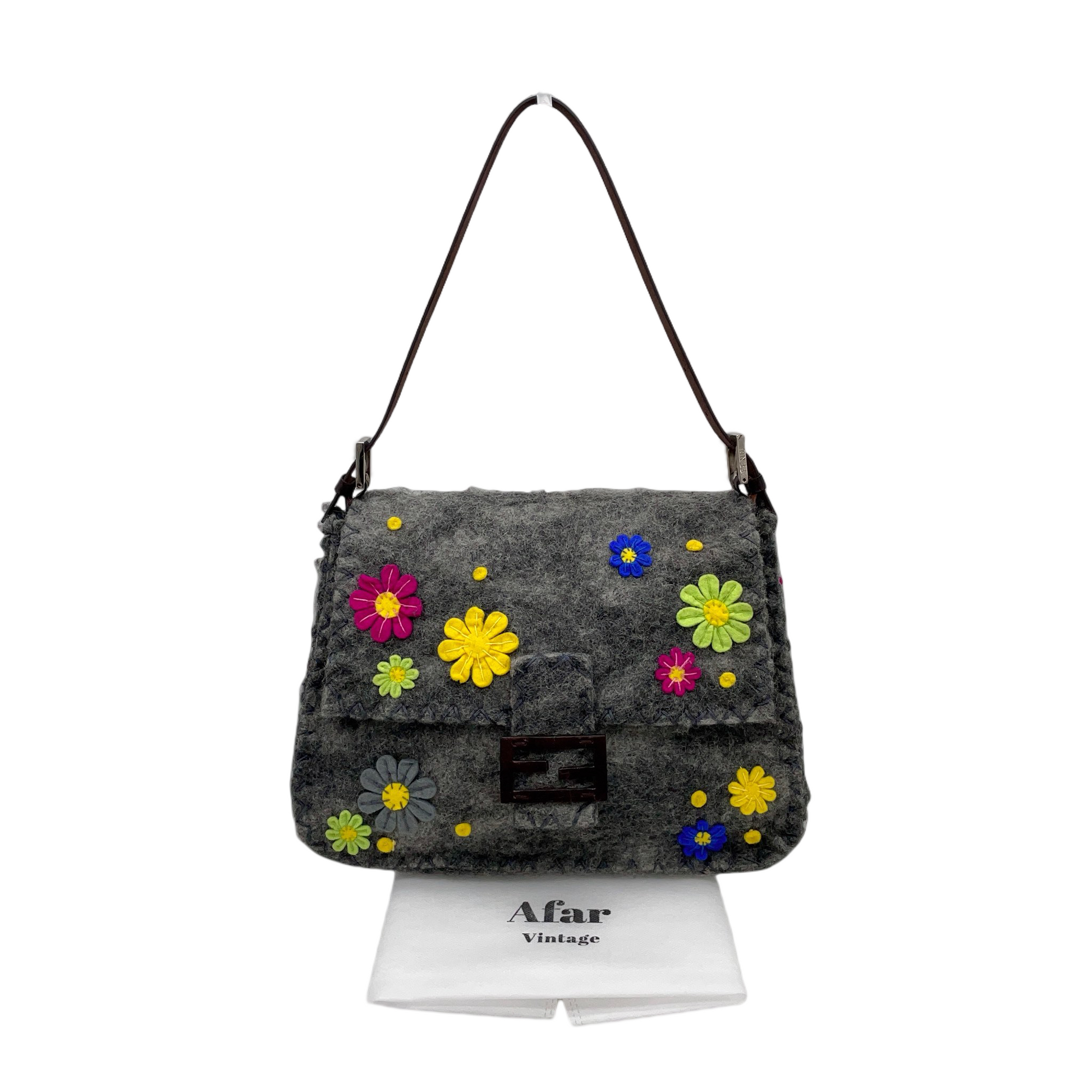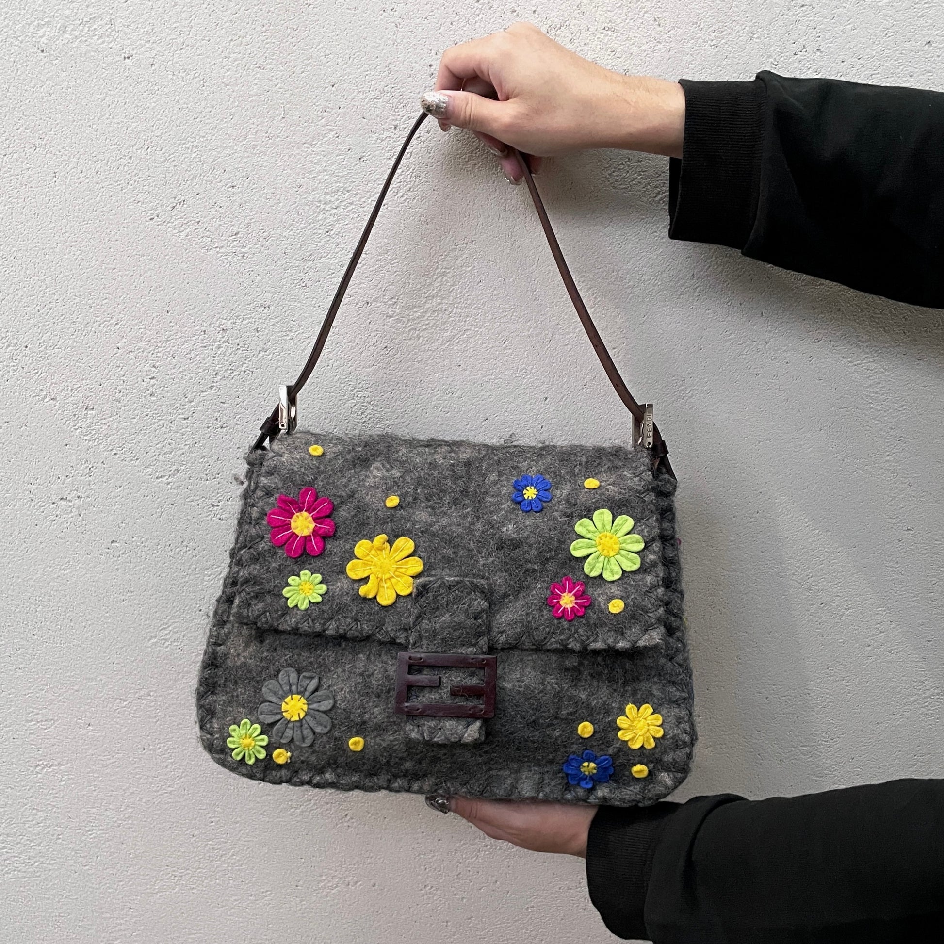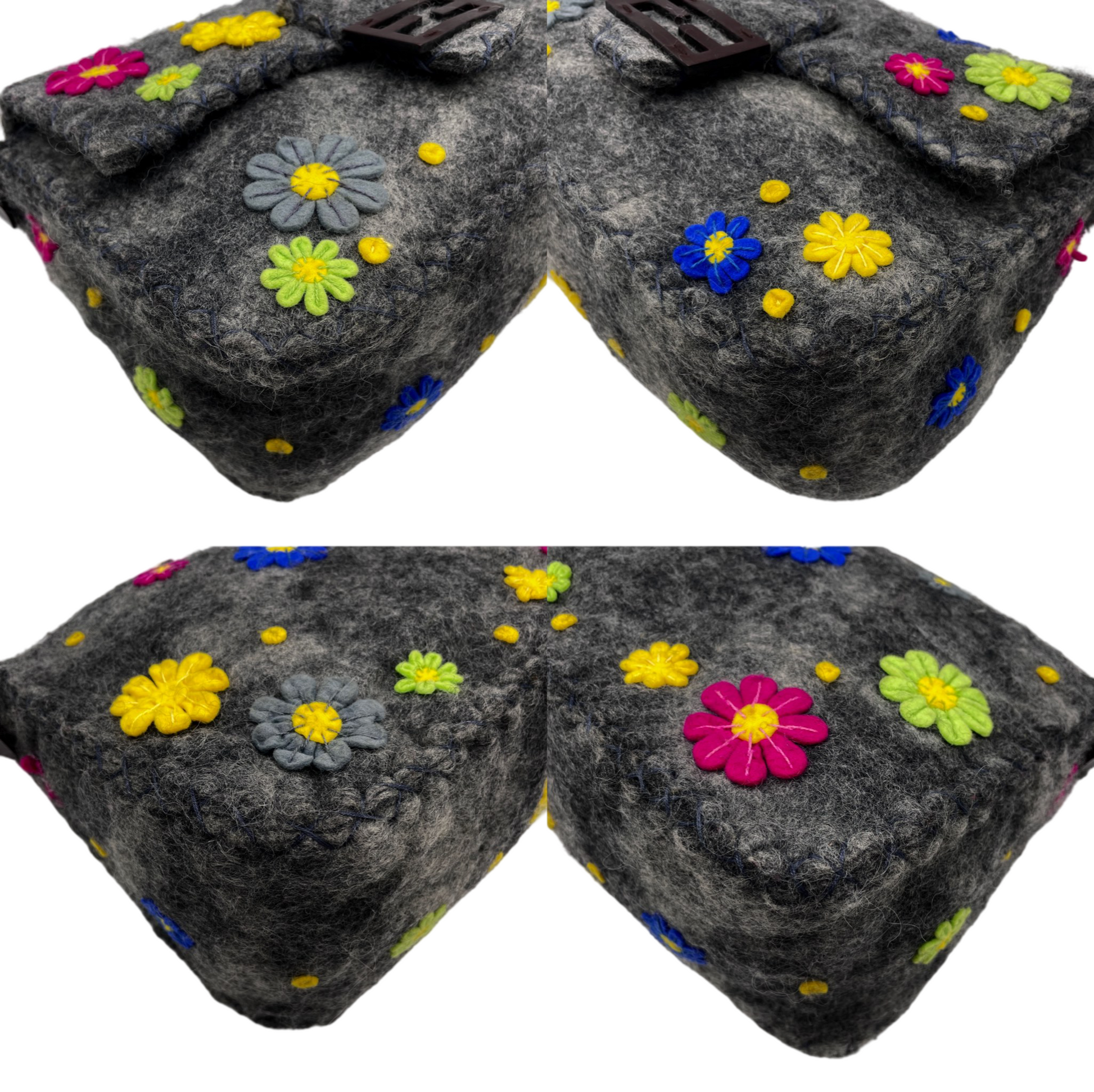 RARE☆☆☆☆FENDI Wool Felt Flower Mamma Baguette GM Shoulder Bag Gray & Multicolor