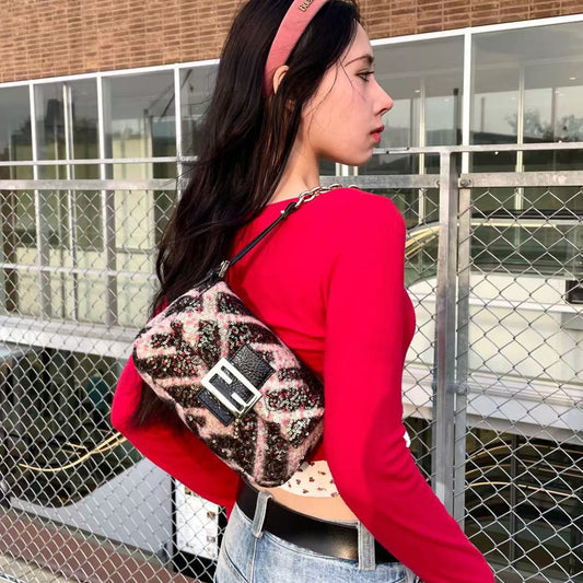 RARE☆☆☆☆Auth FENDI Zucca Tweed Sequins Chain Shoulder Mini Mamma Baguette shoulder bag