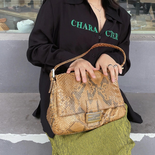 RARE☆☆☆☆FENDI Python Skin Leather Mamma Baguette Shoulder Bag GM Gold & Silver