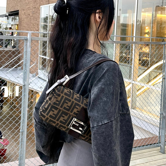 FENDI Zucca Canvas Mamma Baguette PM Shoulder Bag Brown & Silver